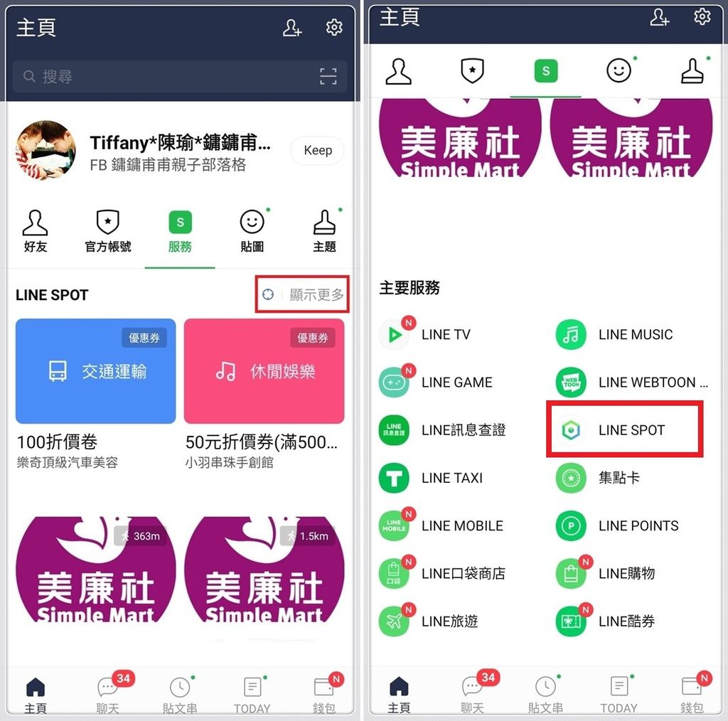 LINE SPOT 就在 LINE 主頁中的「服務」,可以點選「顯示更多」,也可以直接往下拉,都可以找得到 LINE SPOT 的蹤跡,準備開始吃吃喝喝玩耍吧!