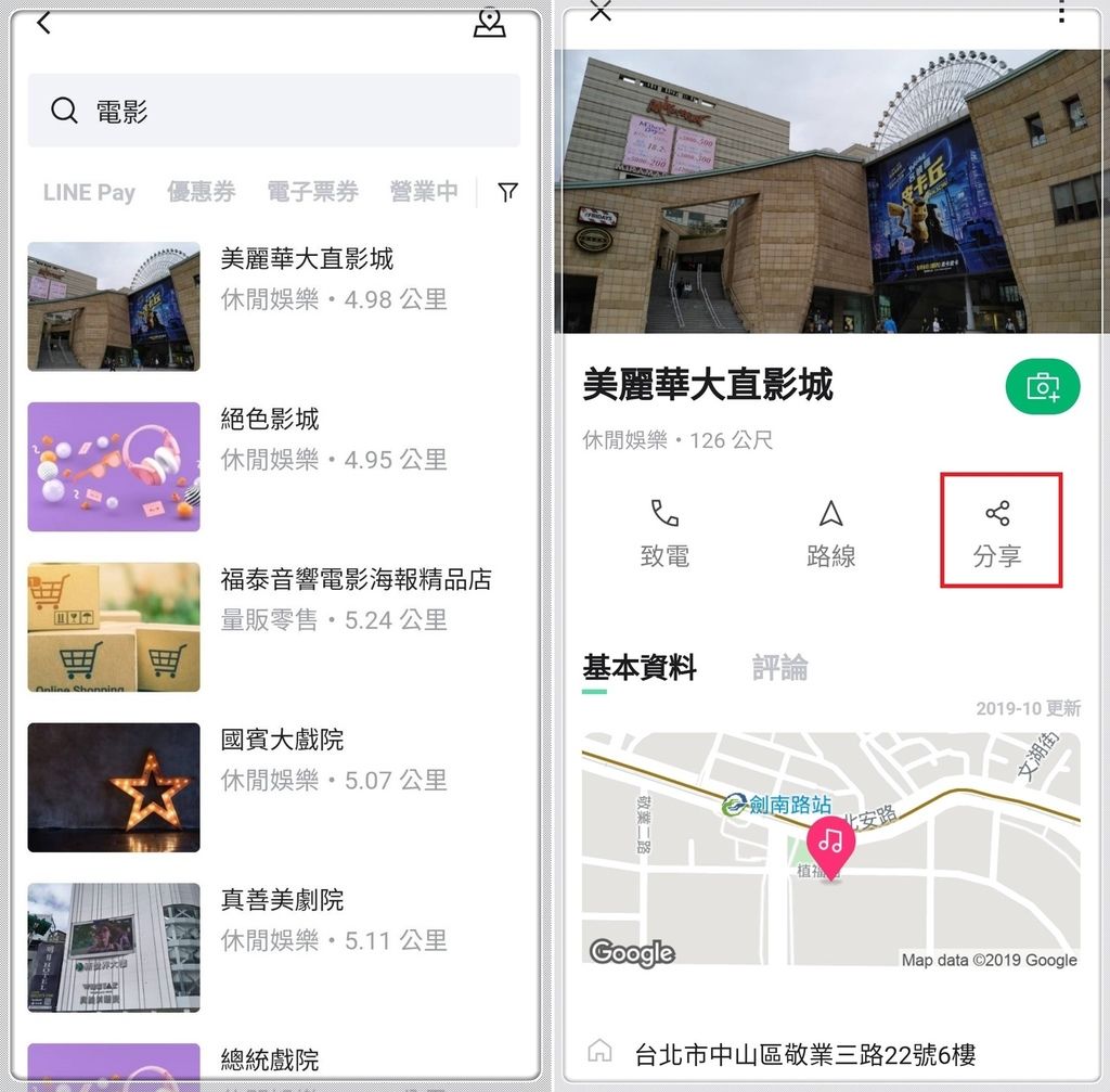 這次我想要去美麗華大直影城,直接點進去就可以看得到店家的地址、電話等資訊,以及與目前位置的距離,甚至還可以點進地圖查看,不用擔心會迷路找不到,實在好貼心。喜歡這個地點還可以直接分享給朋友喔!