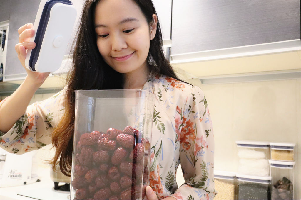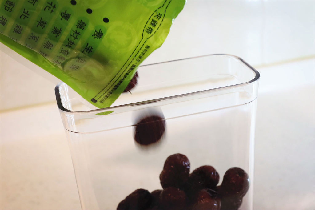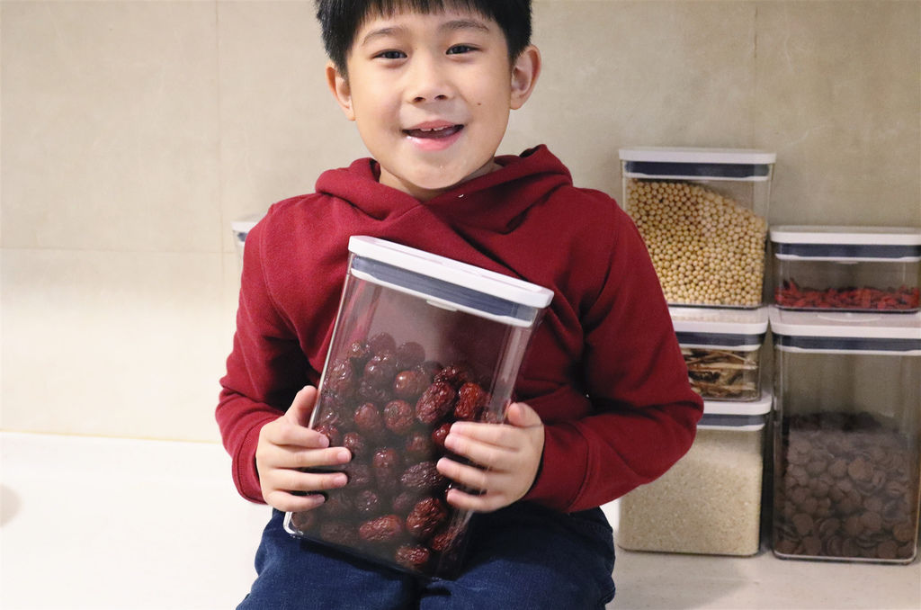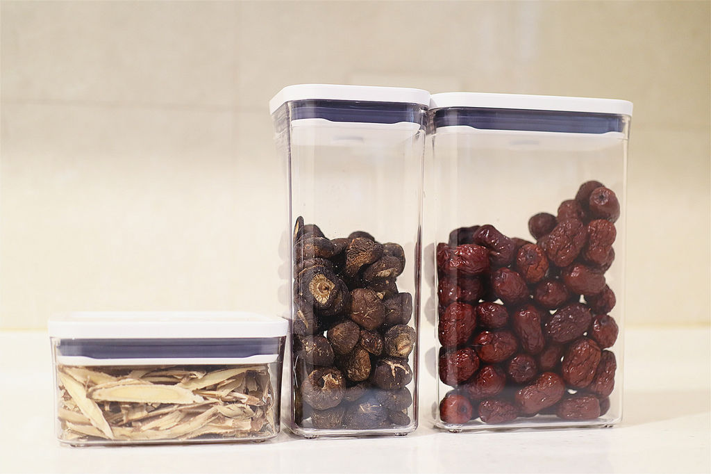 最近也買了好多過年的食材,像是香菇就可以放在正方按壓保鮮盒1.6L、紅棗比較大所以我會選擇放在細長方按壓保鮮盒1.8L這裡,黃耆扁扁的,我就用扁平式的大正方按壓保鮮盒1L來存放!