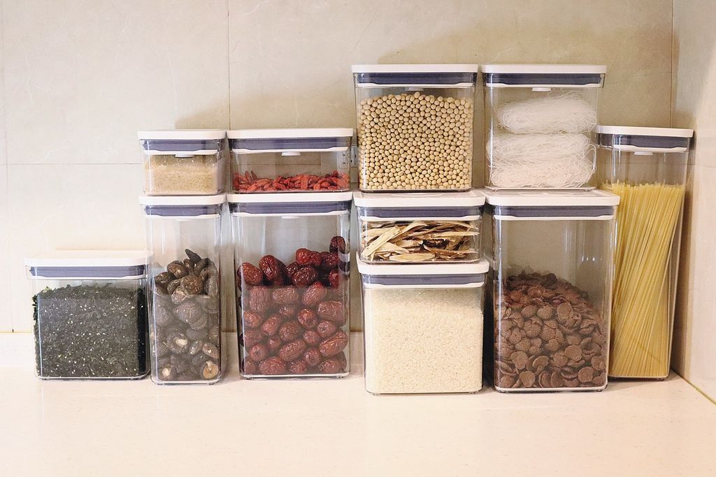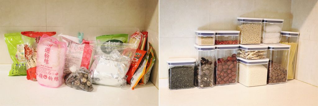 我還特別去觀察有條有理的日本主婦是怎麼進行收納的,甚至還會去買收納書來研究,我發現很多厲害的媽咪會用保鮮盒來裝米,太白粉,麵包粉、乾糧、餅乾糖果這些很怕受潮的食材,也有不少人是拿來裝鹽,糖,烹大師等調味料,尤其是調味料的瓶瓶罐罐大小不一、顏色不同,全部擺在一起其實還蠻凌亂的!