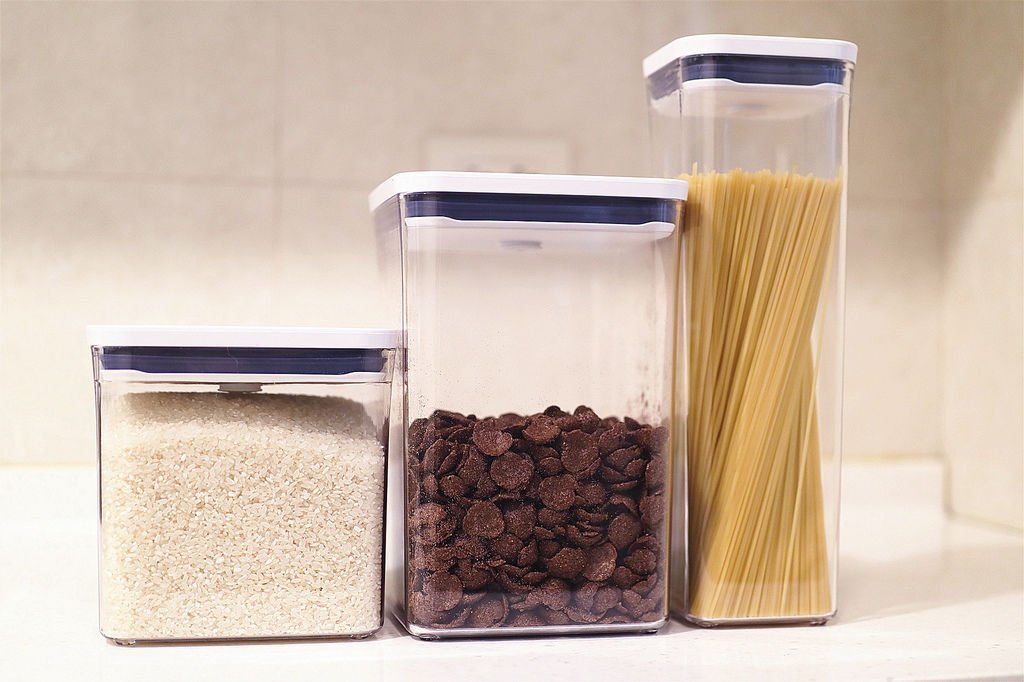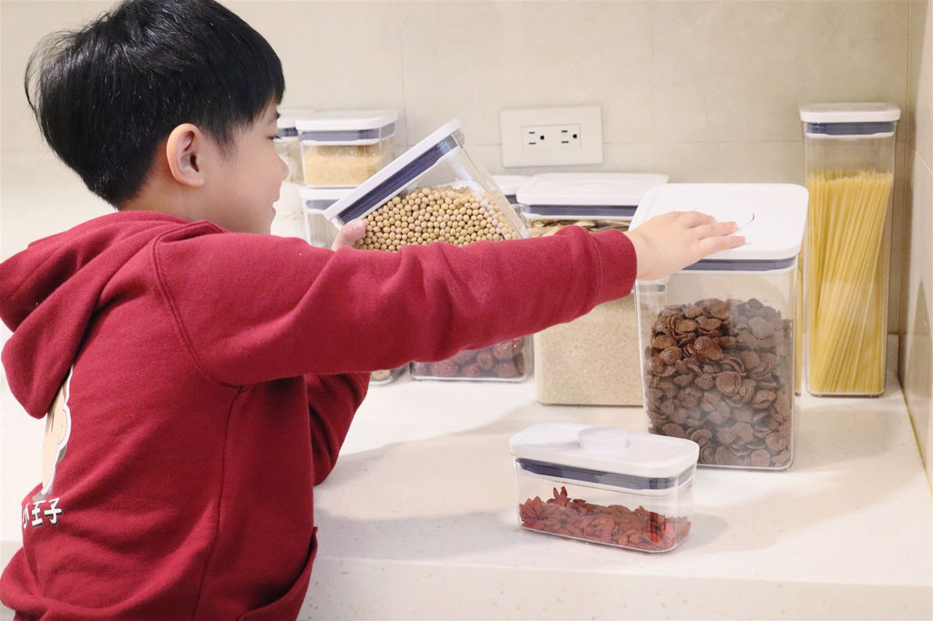 你看我有那麼多款保鮮盒,都是依照食材的特性來準備的喲! 像是大正方形的容器就非常適合放五穀類食品,我把穀片放在4.2L的容器中,就不用擔心穀片容易潮濕變軟,小朋友想吃的時候,也比較好拿取,不容易灑翻;同樣也是大正方形容量為2.6L的保鮮盒我就拿來放置米,空氣無法流通就比較沒有長蟲的煩惱;而這款高高的正方按壓保鮮盒2.1L,拿來放義大利麵最適合不過了!