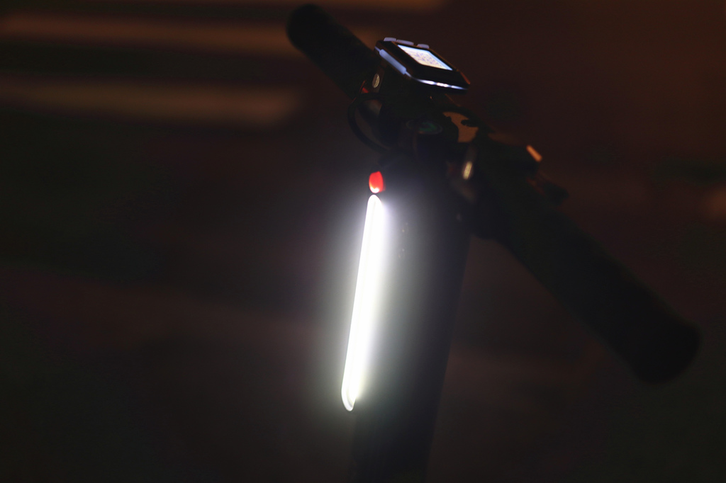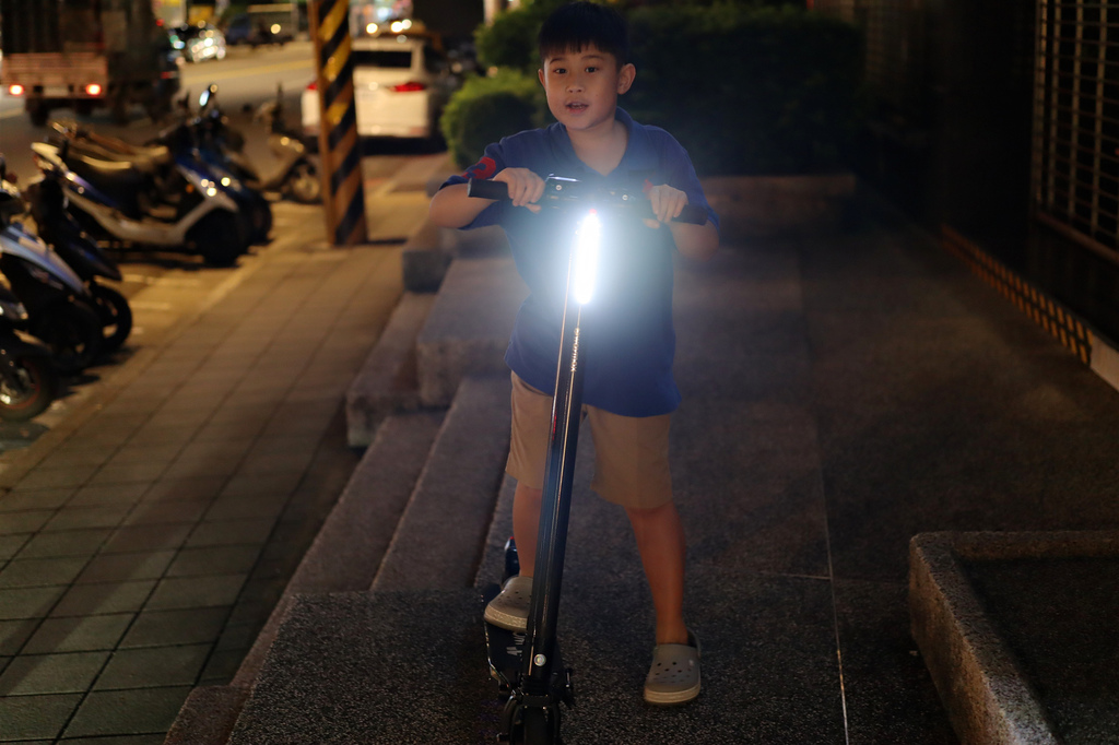 一起看看夜晚騎乘時的貼心設計,不但前方有LED照明燈,後方的煞車小紅燈也都會在行進間持續閃耀著,晚上騎車也可以很放心!