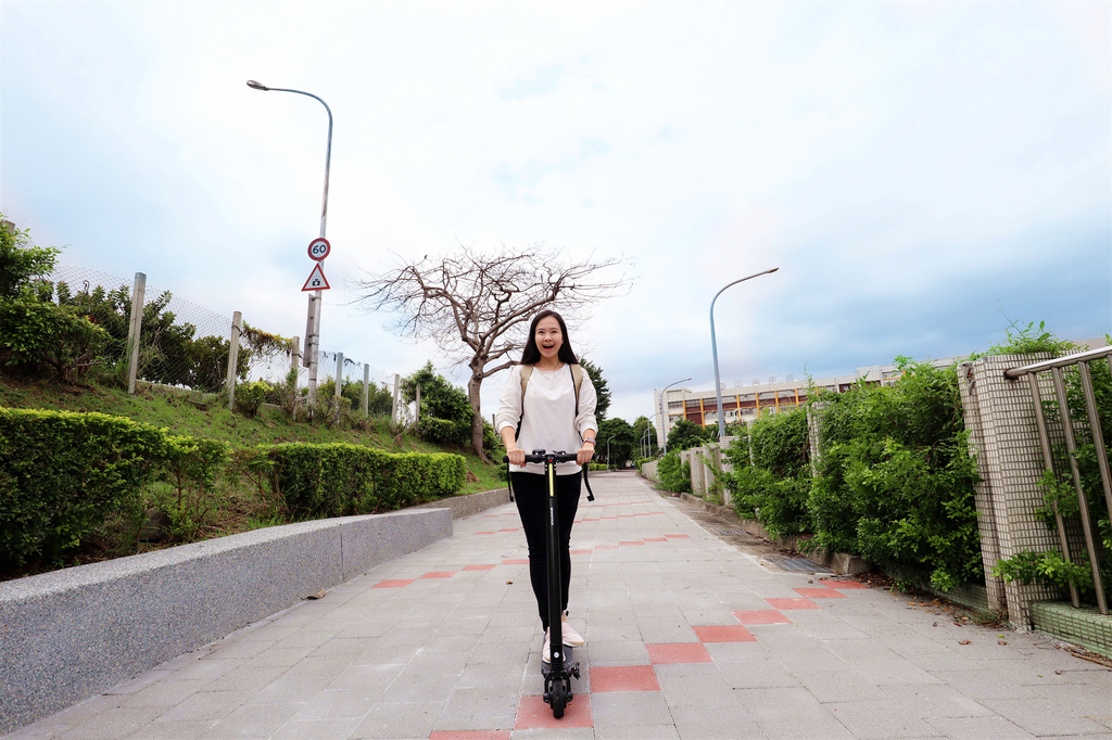 滑板車的輪子比較小,如果設計不良的話,很容易就「ㄉ一ㄠˊ在路中間」,不過這台很棒,連輪胎都很講究,是用高級的防爆輪胎,免充氣,也很耐震,極致穩固,不用擔心會卡在路上的縫隙中,針對這一點我還特別到處騎乘,深入體驗輪胎的性能,我發現即使是路面不太平滑的街道或馬路上,也都能很順利的騎乘!