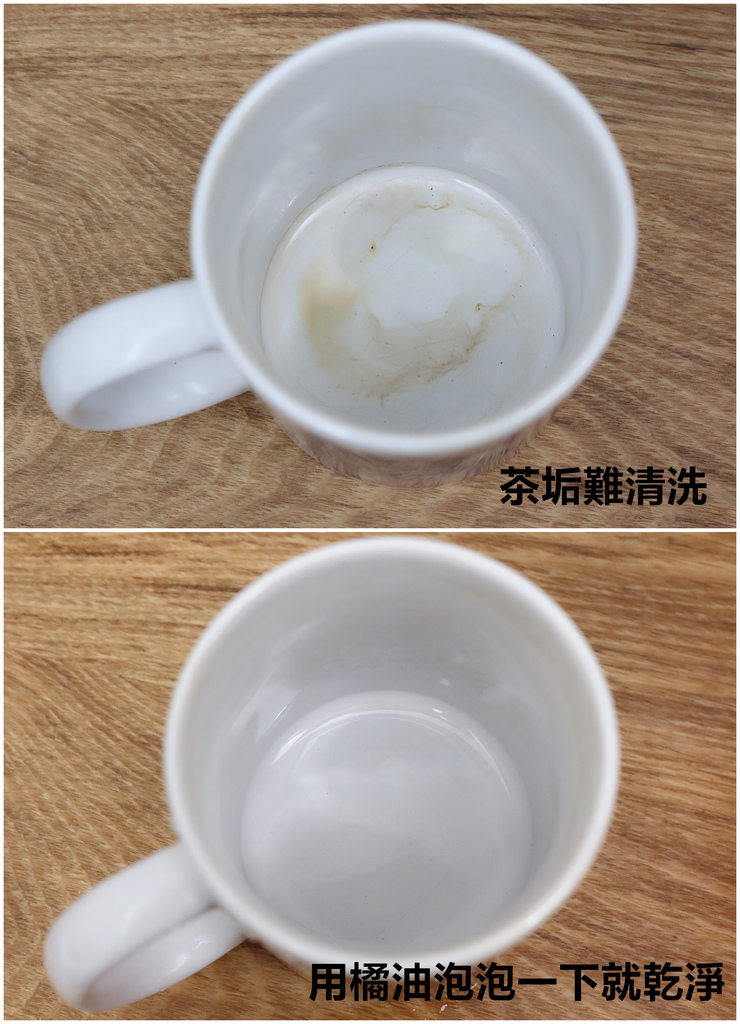 茶杯也經常讓人抓狂,日積月累的黃色茶垢用一般的清潔方式其實效果有限,還是要出動橘油泡泡食器清潔才夠力! 輕輕噴一噴,茶垢立即一掃而空,還我乾淨無比的白色茶杯!