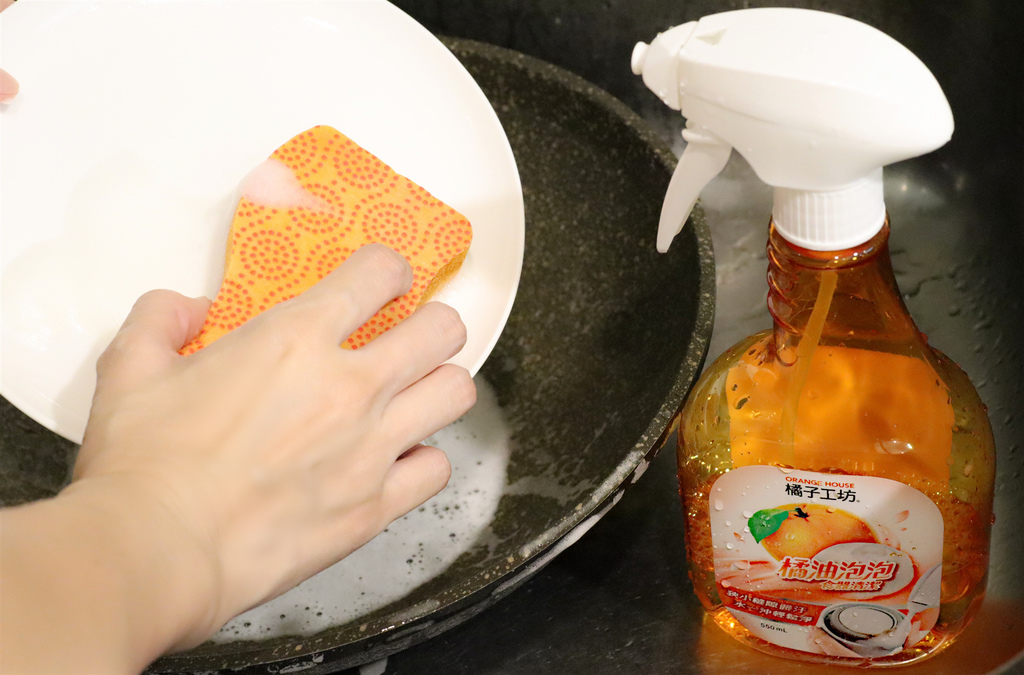 用餐完畢後,我會用【橘子工坊.橘油泡泡食器清潔】來清潔鍋碗瓢盆,我發現即使再油的汙垢,都能迅速瓦解,利用神奇的橘油泡泡大軍,完整包覆油脂髒污,簡單沖洗一下就很乾淨,省時省力實在太方便!
