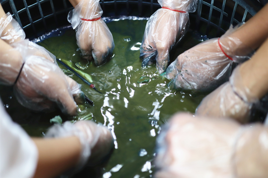 將設計好的方巾浸泡於水中,再浸泡於染劑3分鐘,爾後擰乾在空氣中氧化,來回重複三次流程,就差不多大功告成了!