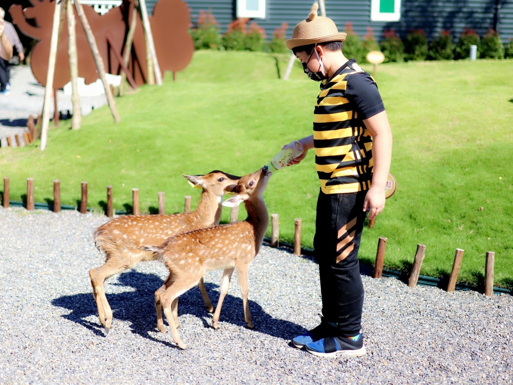 第一站我們來到最夯的小鹿斑比,這些都是初生小鹿,還不能餵食固體食物,只能喝ㄋㄟㄋㄟ唷! 輕輕拿著奶瓶餵小鹿喝奶,溫和的小鹿就會主動靠過來,無比的溫馨感爆棚,才短短不到幾分鐘就把羊奶喝光光囉!