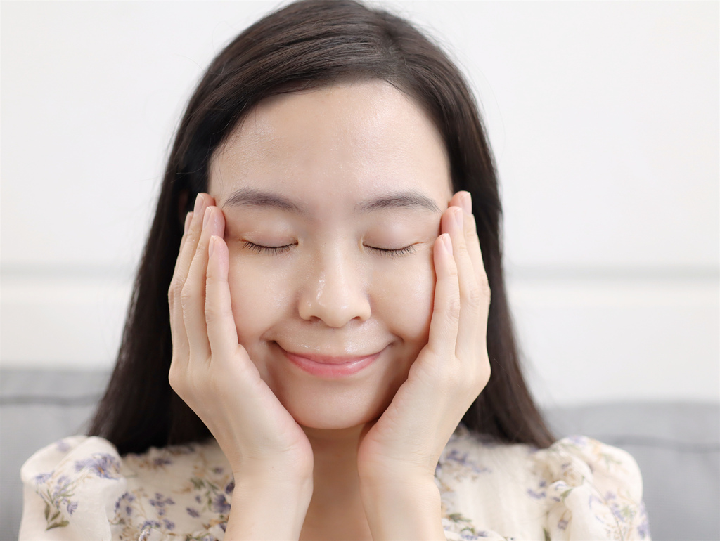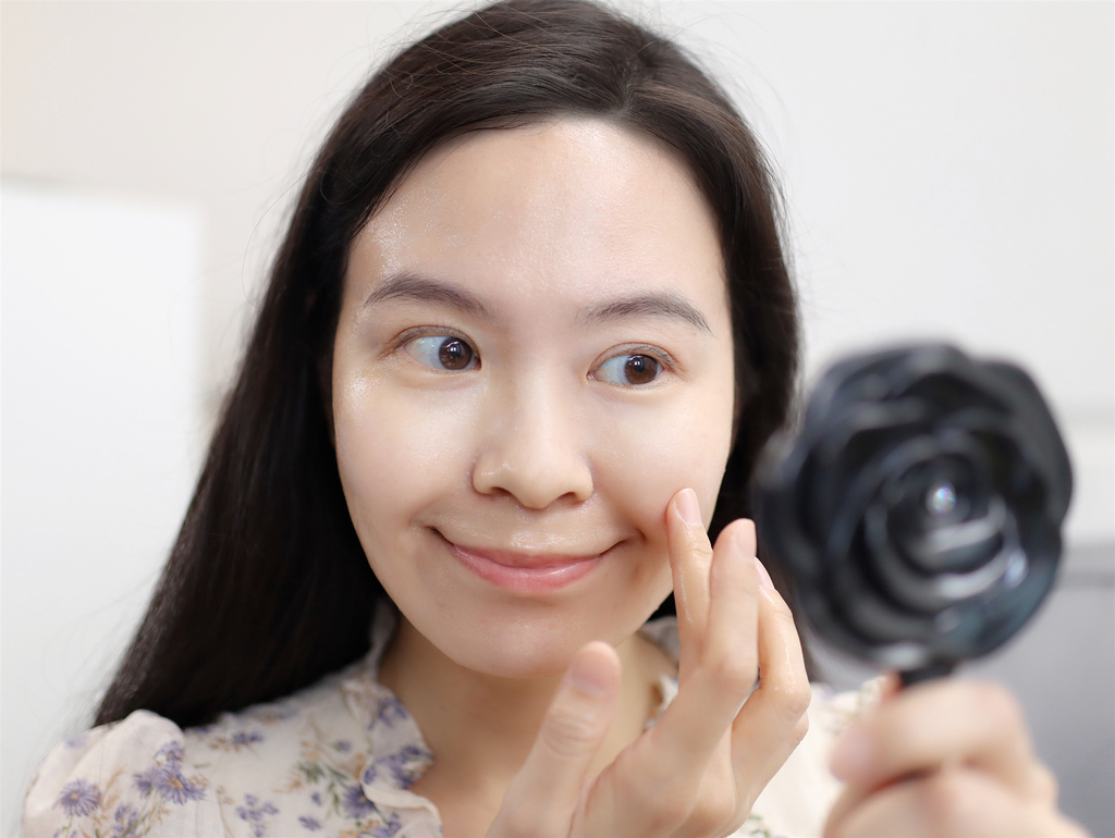 我也會輕柔按摩肌膚,像是比較容易形成斑點的臉頰,還有略顯黯沉的額頭、下巴都是加強重點,把成份通通帶進肌膚底層,讓淨白更有感!