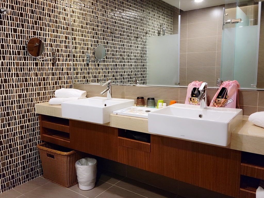 乾溼分離的浴室,還備有兩座洗手台、TOTO免治馬桶、強力花灑,還貼心的準備了兒童專用的洗沐、衛生用品,讓整個沐浴時光非常紓壓!