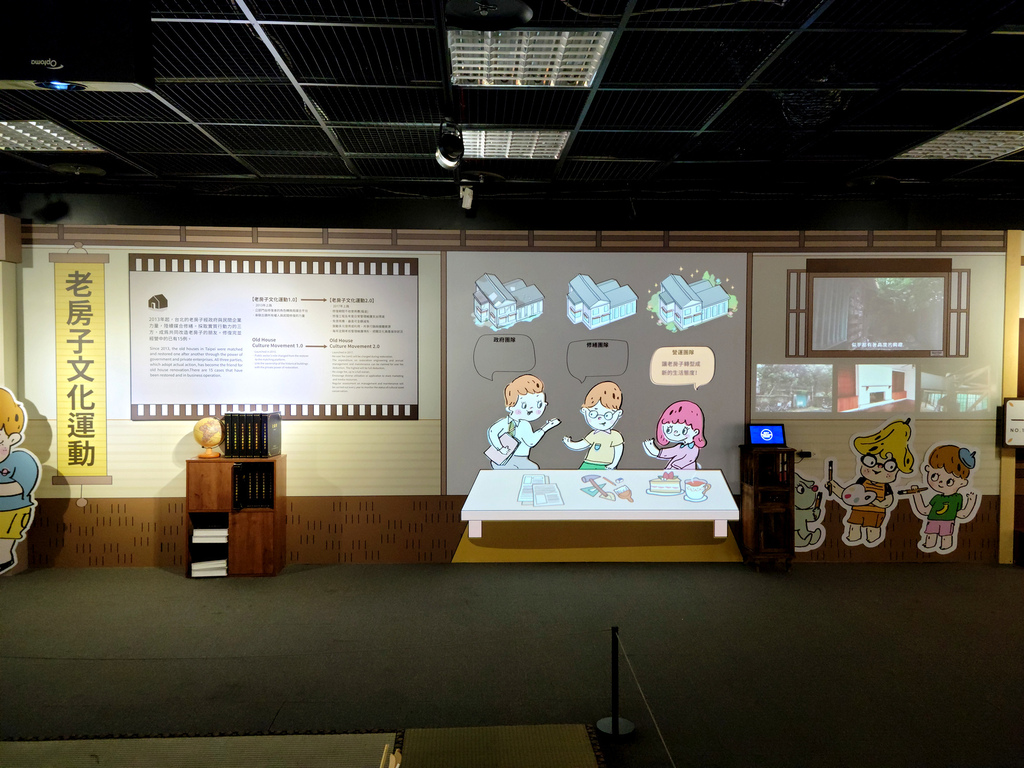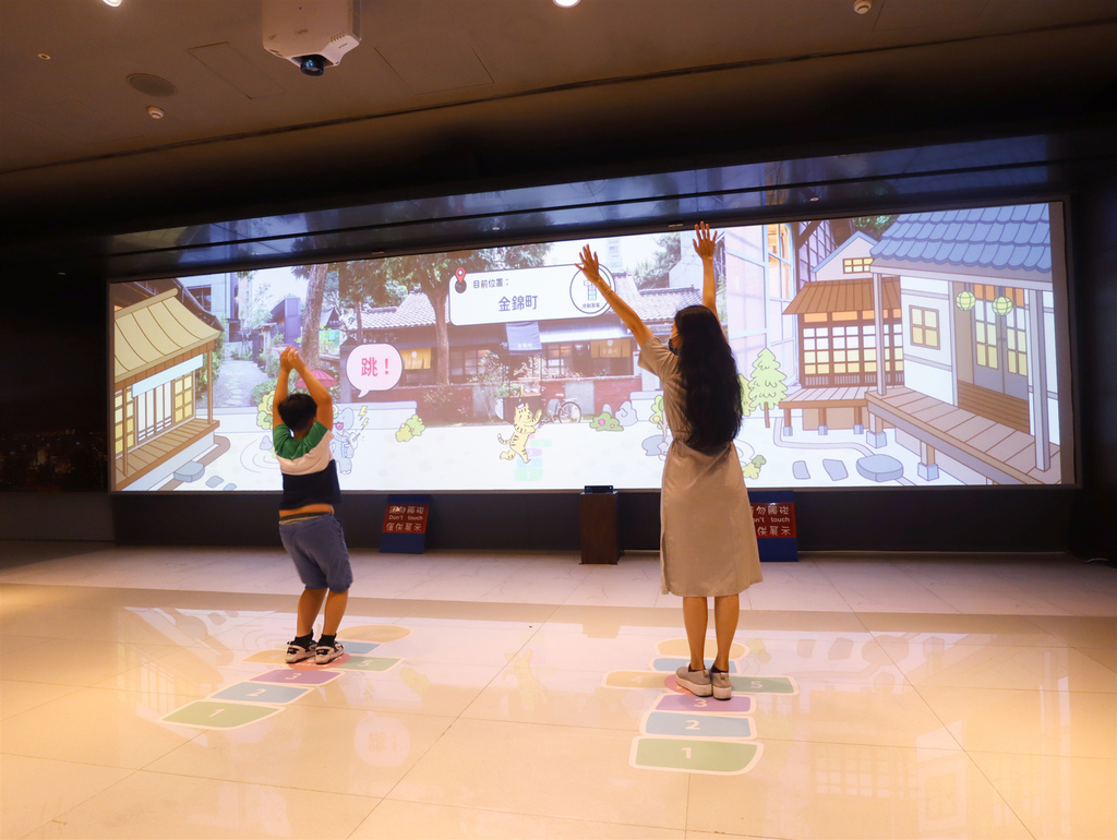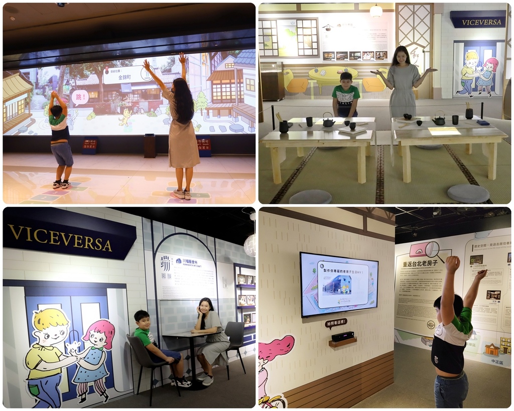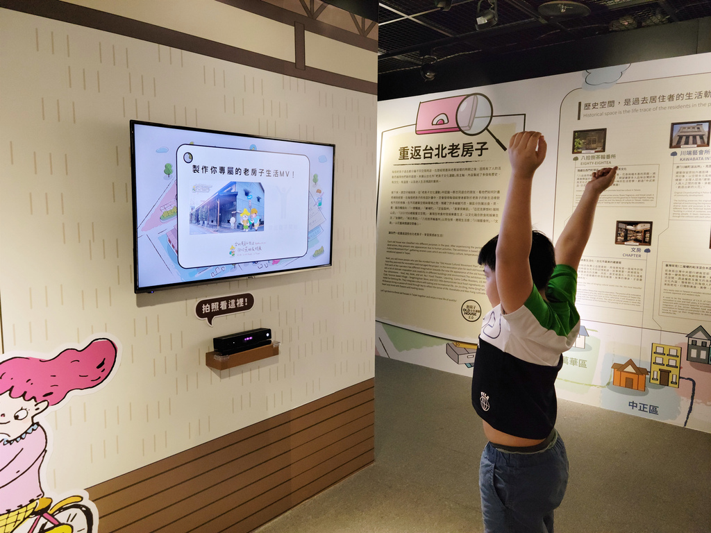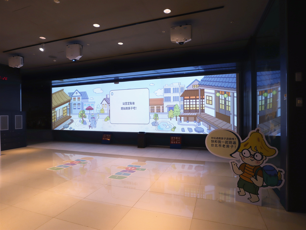 像是一樓大螢幕就規劃了復古有趣的「跳房子」多媒體遊戲,立刻喚醒我兒時的記憶,不但可以透過遊戲看到老房子修復後的現況,還能認識「老房子文化運動」的精神,廣大的投影拼接長廊,體驗跳房子互動,新奇又有趣,和孩子一起跳遍台北老房子,開始進入一個個別具風格的台北生活囉!