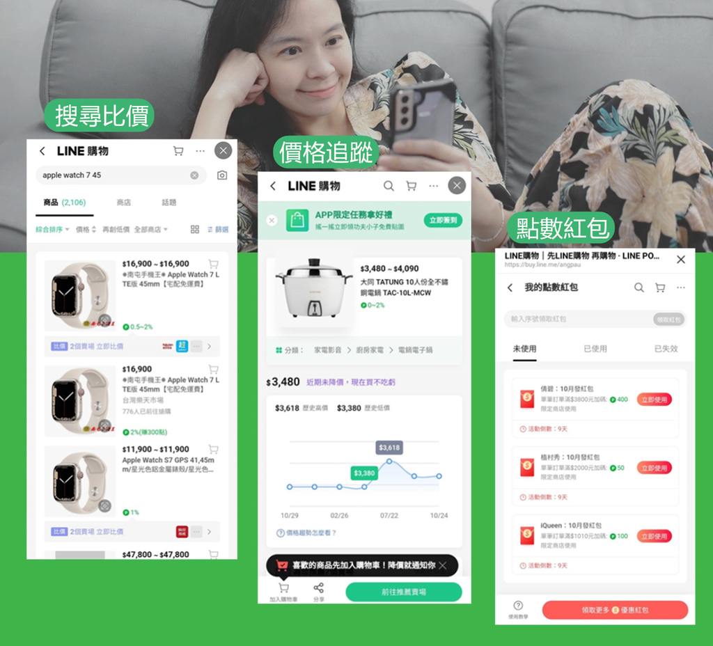 還有「價格追蹤」的貼心設計,可以持續關注某款商品的價格,以及 LINE POINTS 回饋比例,超值好康就絕對不會錯過!