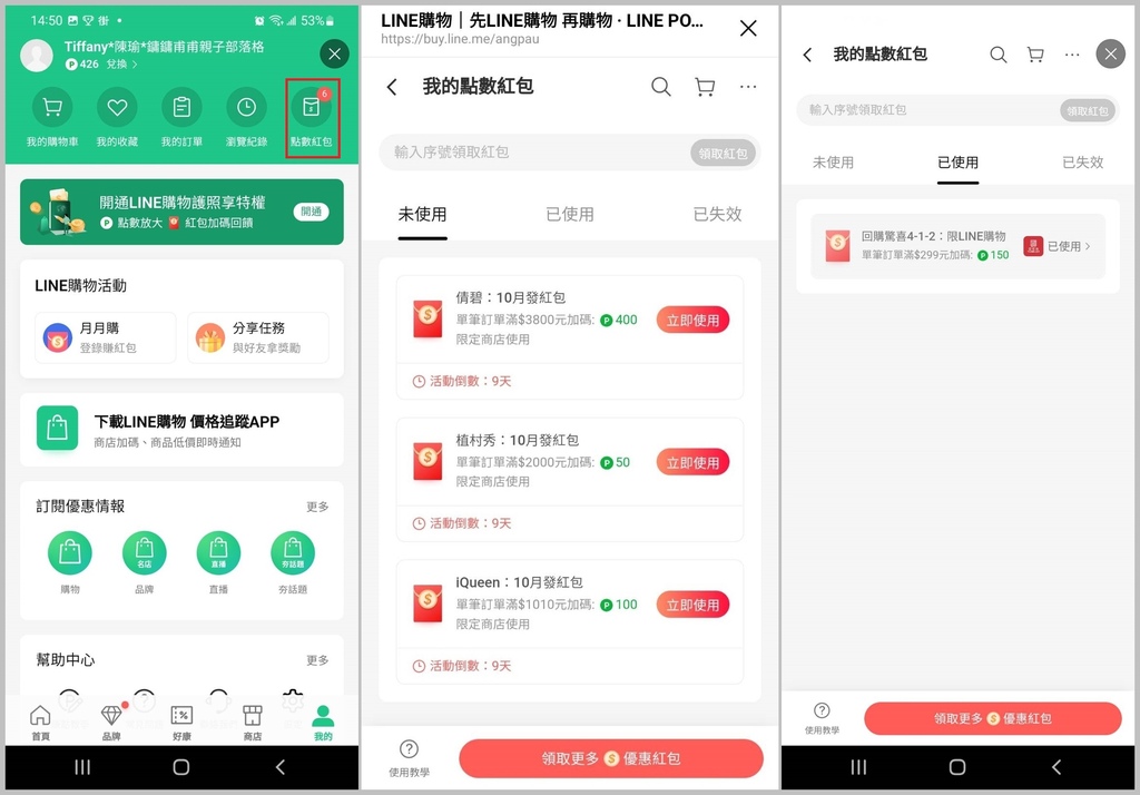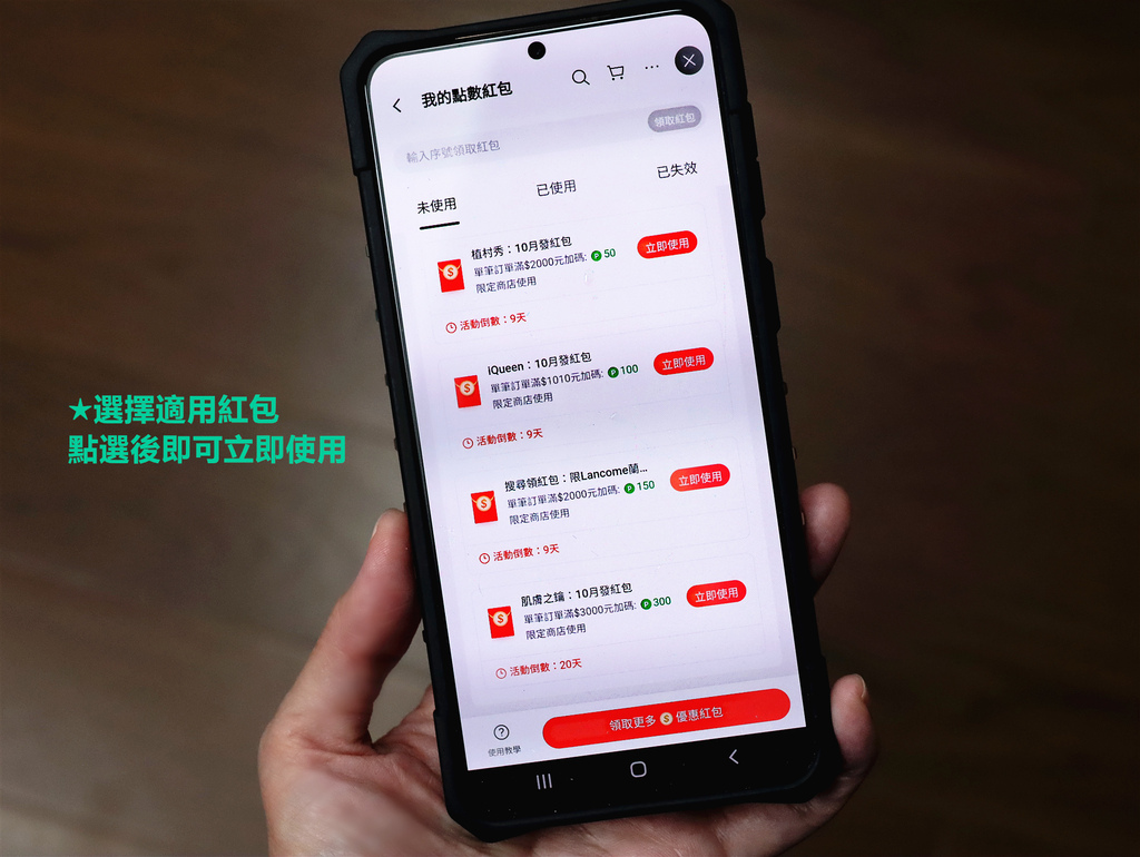 查看自己的點數紅包也非常方便,只要點進「點數紅包」,就可以立即查看目前未使用、已使用以及已失效的紅包,還能點擊下方按鈕,領取更多優惠紅包,簡單來說,就是好康多到拿不完啊!