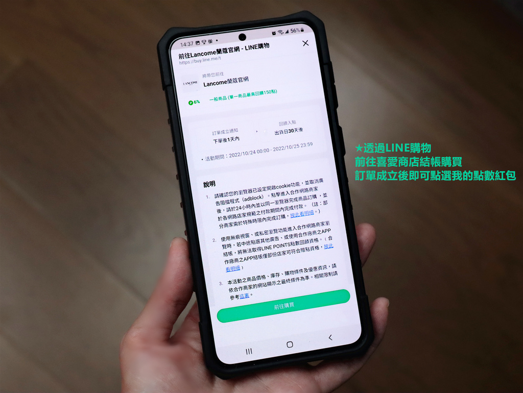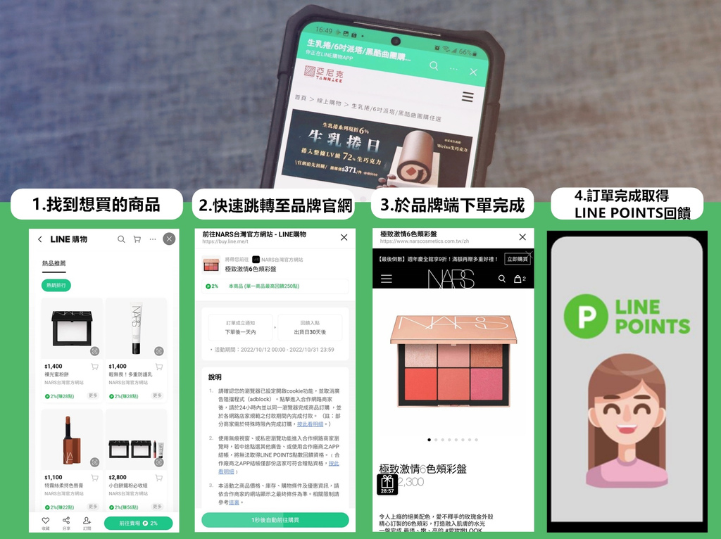 每次購物我都會先開啟LINE查看商品資訊,可以迅速搜尋到想買的商品,確認購物後只要點選商品,就能快速跳轉到下單頁面,再直接導向品牌端下單完成,訂單完成後即可取得LINE POINTS的回饋點數囉,這樣的購物方式超級有效率,更棒的是回饋超多唷!