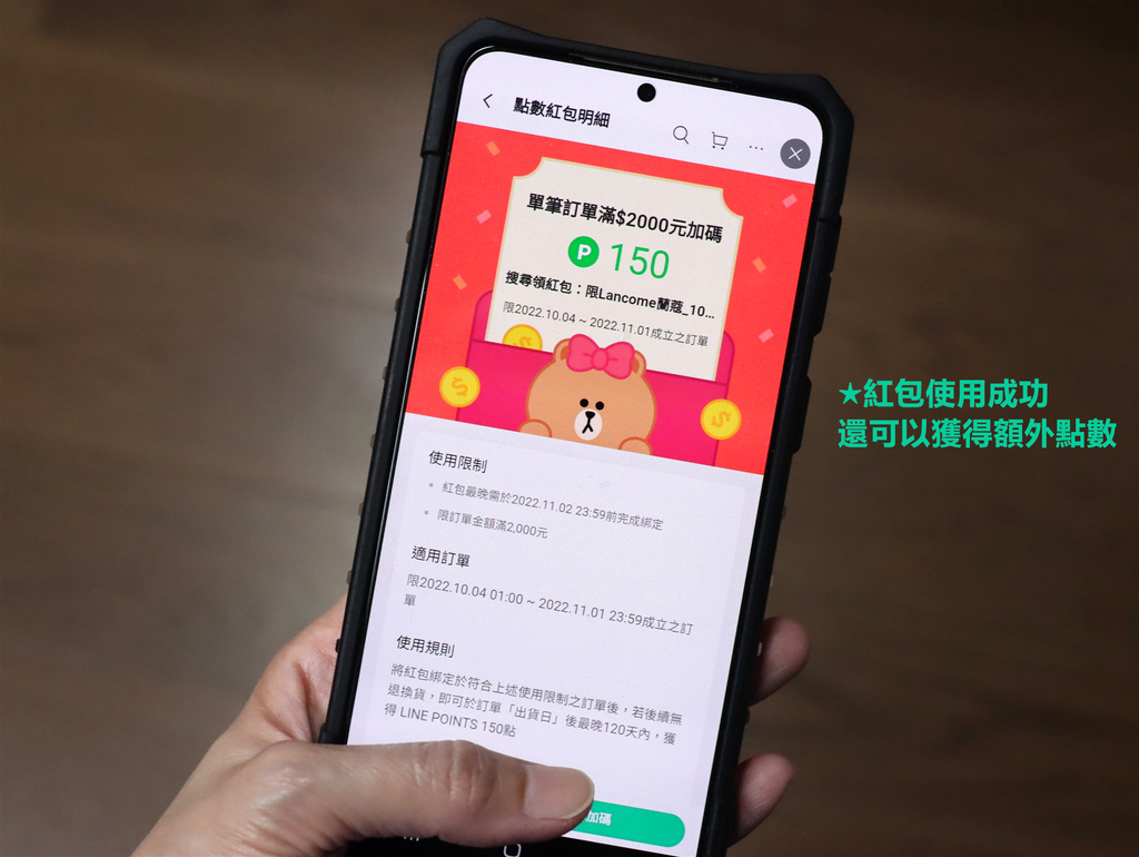 我也好愛領「點數紅包」,只要在點數紅包訂單成立時間內,透過LINE購物App前往LINE購物合作商家頁面,完成一筆符合點數紅包顯示之消費金額門檻訂單,就能立即獲得優惠,真的是省很大呢!
