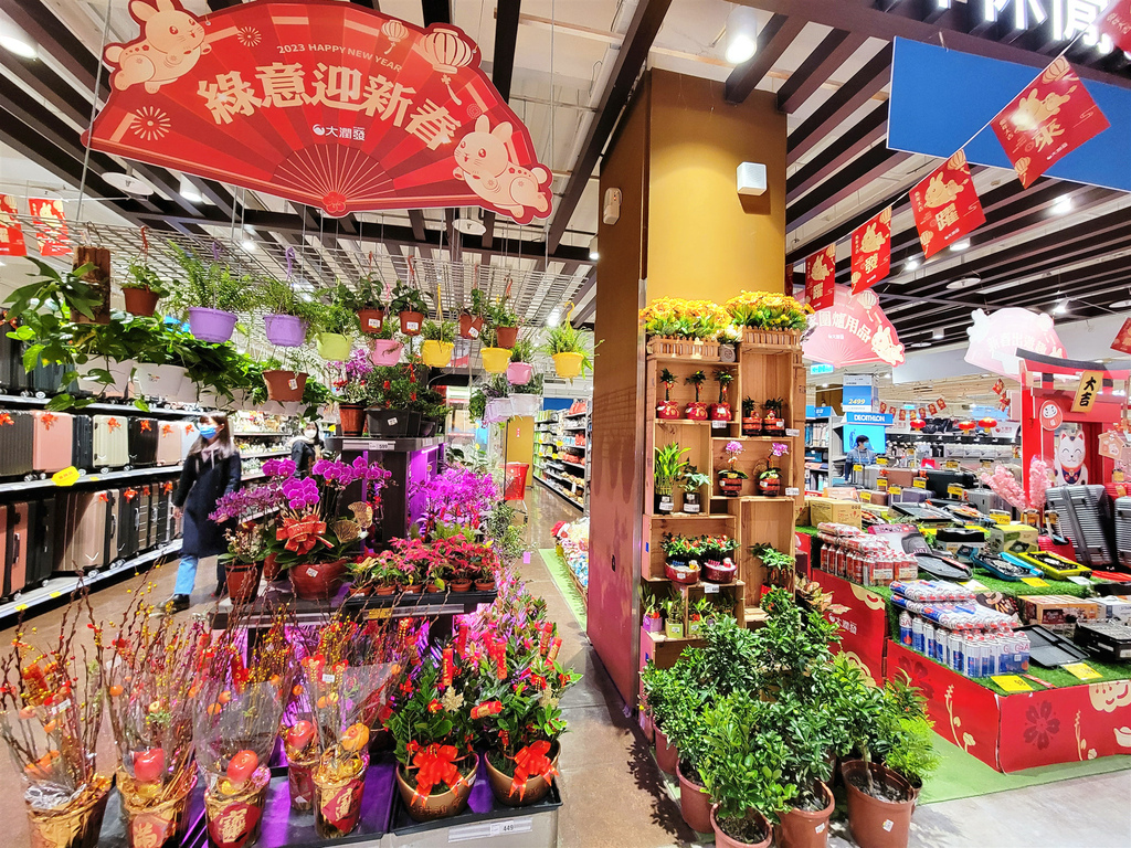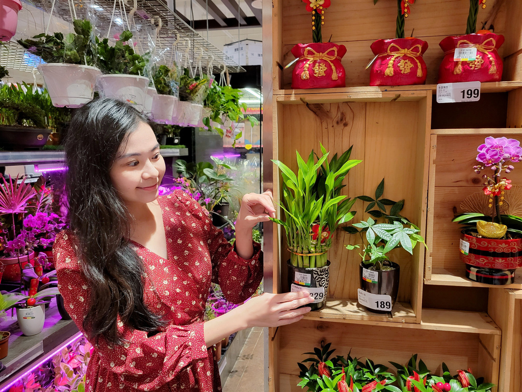 一進到二樓賣場入口處,就更能感受得到喜氣洋洋的氛圍,每個角落都是紅通通的,仔細一看,象徵喜氣的過年植栽、紅色居家擺飾,都有好多種類可以選擇,以前我要買個年貨必須跑迪化街、花市、夜市,現在只要在大潤發就能一次買齊,也太方便了吧!