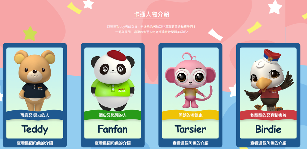 有幼兒想要學習英語,但個性又有些害羞的話,可以使用NativeCamp獨家的「卡通人物互動老師」,是以非常可愛的玩偶來吸引孩子、拉近與孩子的距離,小朋友面對的是逗趣無比的卡通老師,就更能自在又快樂的學習英文囉!