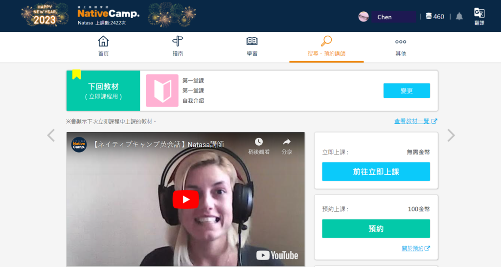 選擇老師後若老師正在線上,就可以立即點選、立即上課,一鍵上課就是那麼簡單,也可以使用預約功能 (歐美籍母語老師皆需預約),也都很方便!