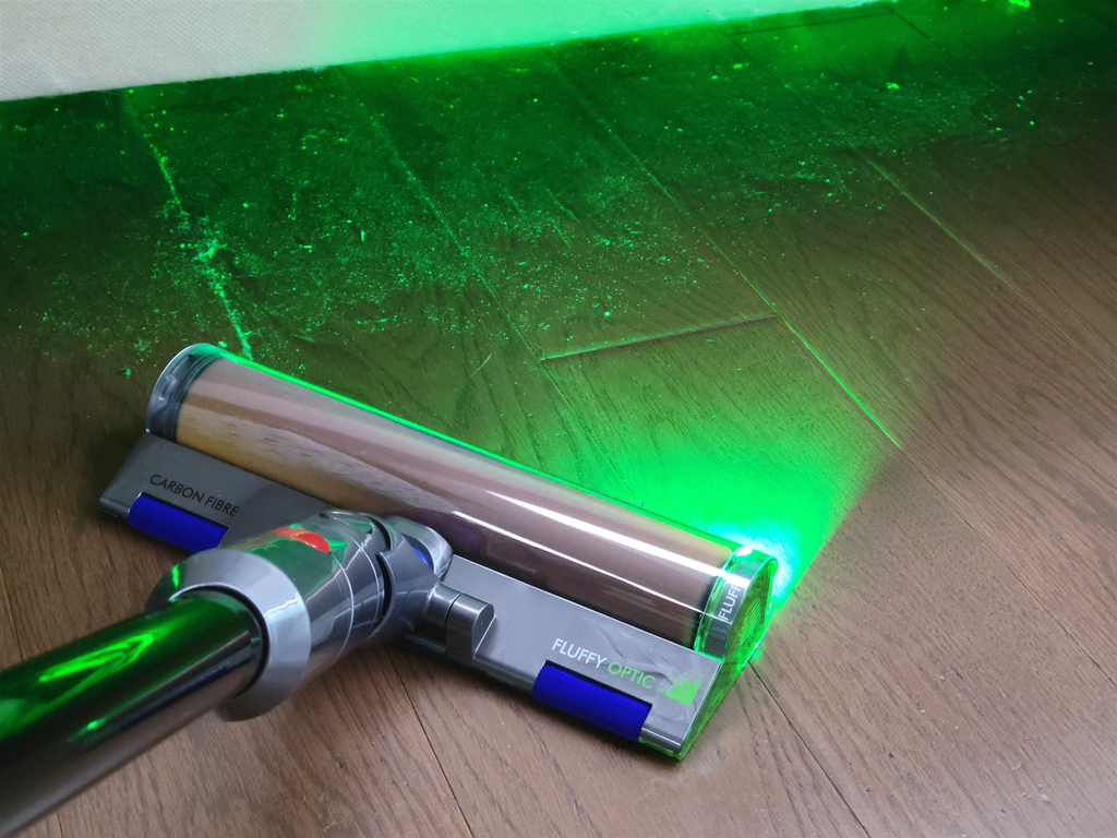 經由容易辨識的綠光,透鏡折射以離地1.5度的角度照射地面到,把平時肉眼看不見的微塵徹底照亮,各種灰塵當然也就逃不出我的手掌心囉!