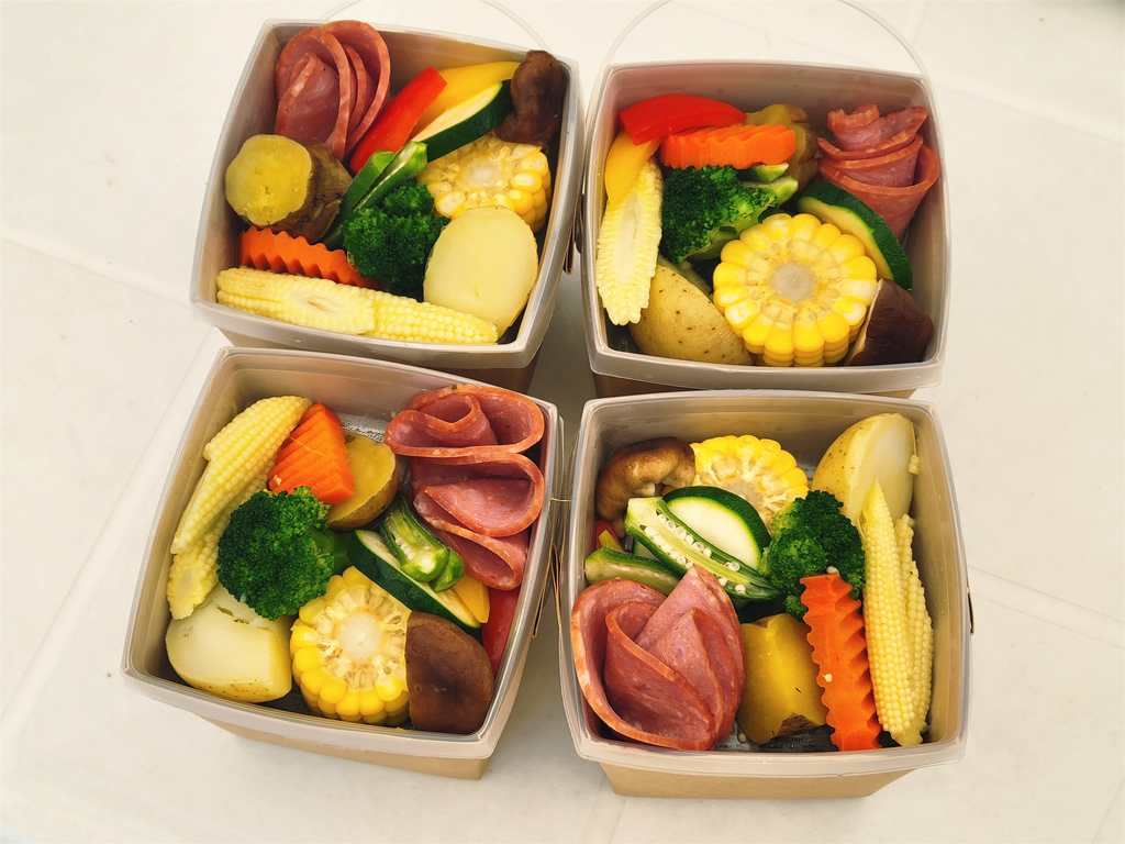 第一層是健康蔬果,也搭配菇類、火腿和地瓜,吃起來相當清爽!