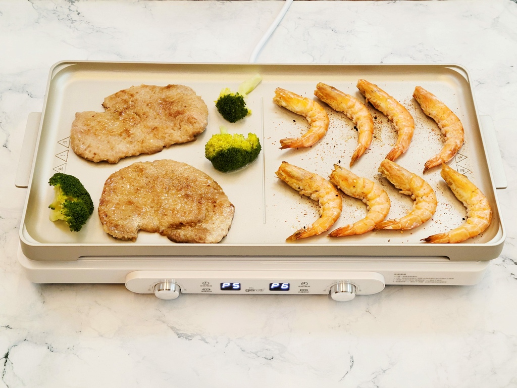 烤盤的長型設計,一邊烤肉品、一邊烤海鮮,兩邊風味不打架,實在好貼心!
