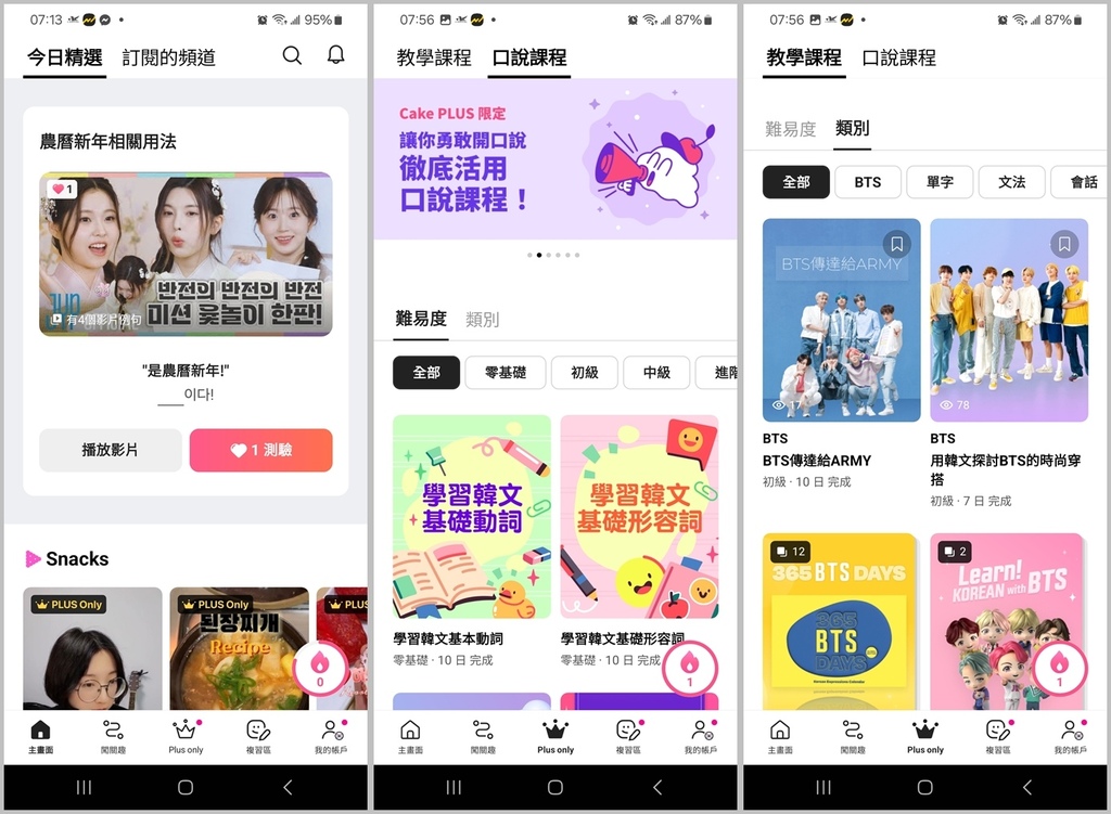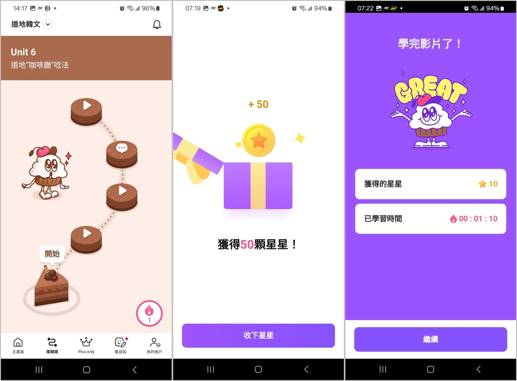 雖然Cake是免費App,但我實際使用後覺得Cake plus比較方便,因為沒有廣告,這樣就不會打斷讀書節奏,也有愛心無限吃到飽,就能按照自己學習計畫學到飽,還比一般免費版本能使用更多功能,像是闖關趣、口說、各程度課程都有,查了一下官網,才發現使用Cake plus 實際學習時間比免費使用者多出 11倍,學習量也多7倍,讓韓文程度大大提升!