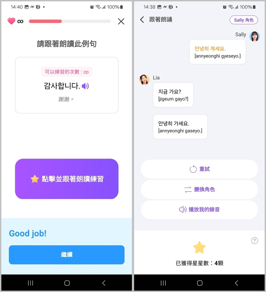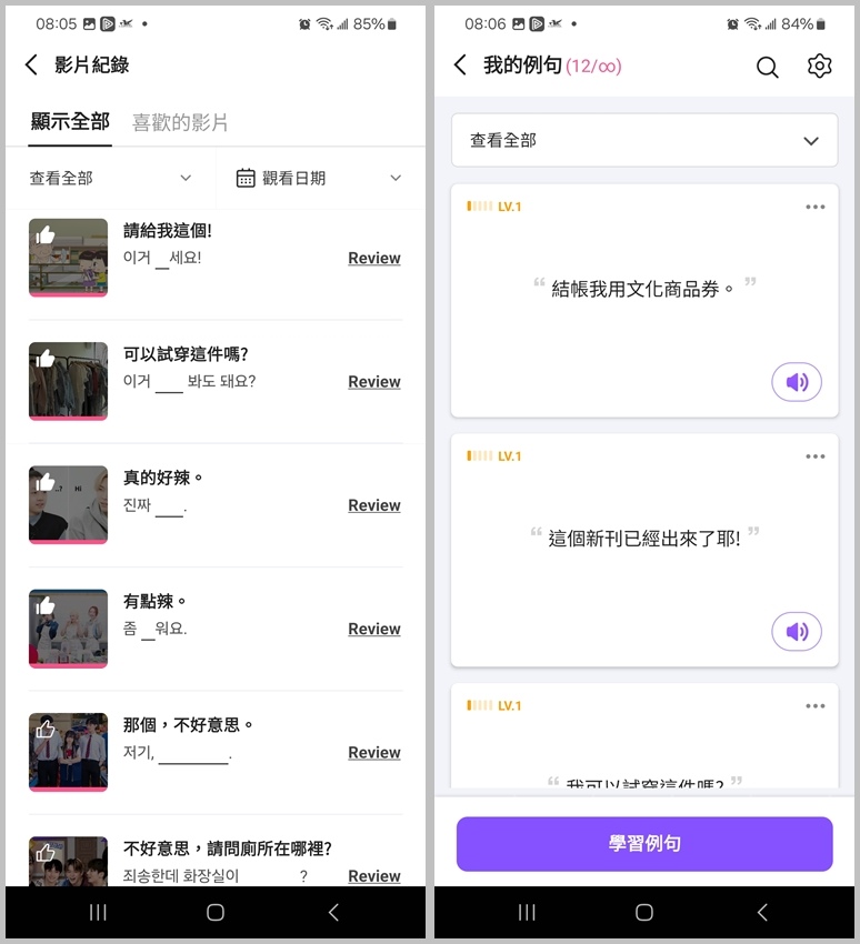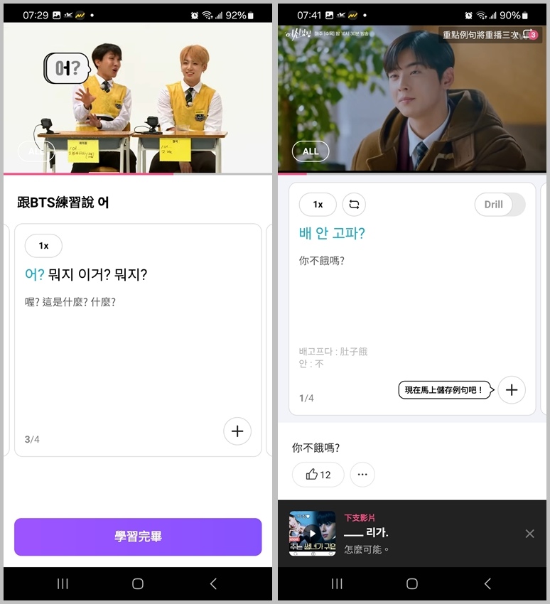課程影片和口說朗讀都是讓韓文更精進的神助手,看一看影片就不小心把韓文學起來了,這種沉浸式的快樂學習果然超級有效耶! 真的好喜歡Cake上萬則的Youtube、韓劇、韓綜、動畫和老師示範的教學影片,可以學到最道地的英文實用會話用法,連文法都有唷,這種結合趣味和資訊的學習方式,真的是教科書沒法比的,也比其他類似的韓文app內容更多元化,想跟BTS練習說韓文,或跟韓劇中的歐巴歐膩一起溜韓語,在Cake裡都找得到!
