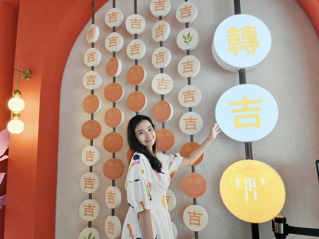 這面轉吉牆也太夢幻了吧,每個圓盤都可以轉動,三款圖案吉、橘子、樹葉都是獲得好運的象徵,還可以透過轉牌將「吉」字連線,據說這樣就可以讓自己的好運旺旺旺唷!
