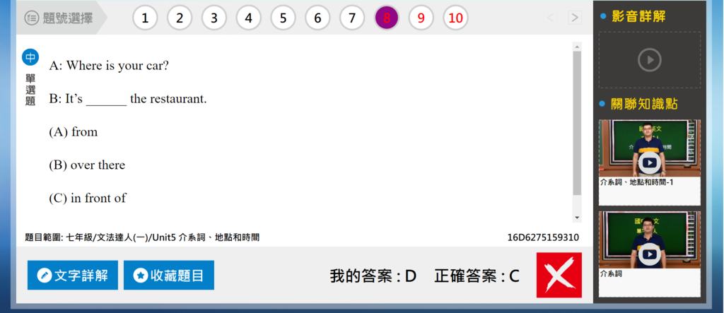 線上題型也很多元豐富,遇到不懂得題目,也可以在作答後即時查看影片解析,連結到「關聯知識點」的影片,立即糾正錯誤觀念!