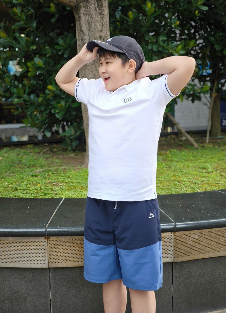 幫甫甫準備一些帥氣又實穿的衣褲~一件是有領子的 Liquid Touch 系列刺繡POLO衫,質感超好、穿起來紳士又有精神,另一件是 圓領寬鬆短袖上衣,簡約設計但穿上去整個小朋友的活力感都爆棚!搭配的是我超推薦的「3M拼色短褲」,它是選用 3M™高科技材質,吸濕排汗又防潑水,還有四面彈力,穿起來完全不侷限~爬上跳下都超自在,彈力抽繩的腰頭可以調整,甫甫跑跳一整天都恣意舒適!