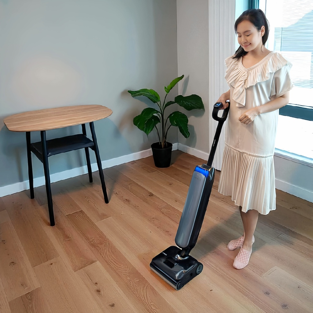 它有一個 「AI 全向智慧助航」,搭配 360° 超敏感的「航空級陀螺儀」,推起來完全不費力,手感滑順,做家事的時候還能有種貴婦優雅感!更酷的是,清潔完只要輕輕按一下關機鍵,機身自己就會回正,還會順便把殘留的水漬帶走,完全是懶人福音啊!