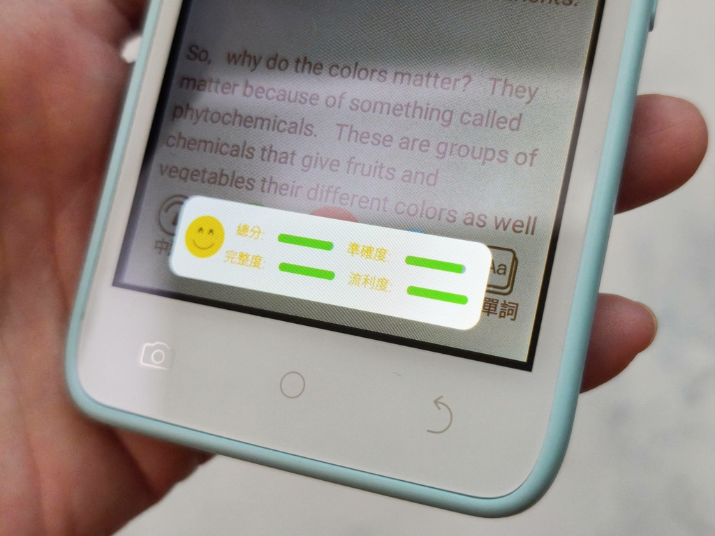 再來是我覺得最有趣的部分~ 按下「跟讀」之後,系統會立刻幫孩子評分!跟讀的準確度、完整度、流利度都可以馬上看得到,可以知道自己發音的優缺點,這種即時回饋真的很棒,不但能幫助調整發音,也能讓孩子有挑戰感,每次都想再多唸一次、更進步一點,對於克服「不敢開口」真的超有幫助!